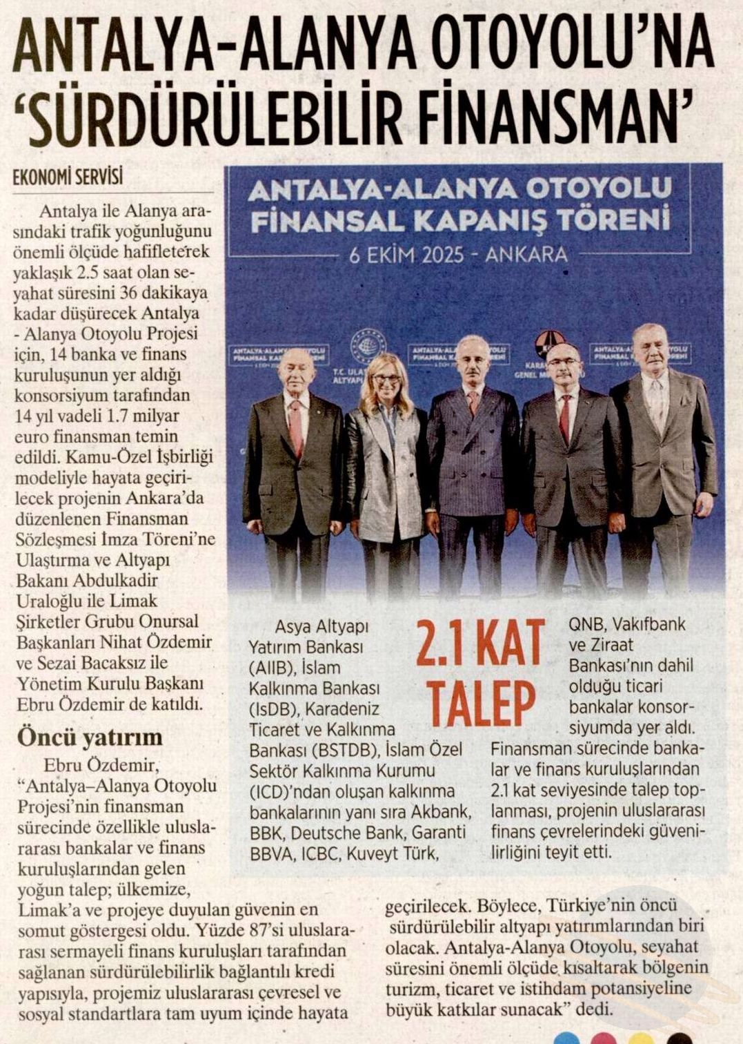 ANTALYA – ALANYA OTOYOLU’NA ULUSLARARASI KAYNAKLARDAN SÜRDÜRÜLEBİLİRLİK BAĞLANTILI FİNANSMAN
