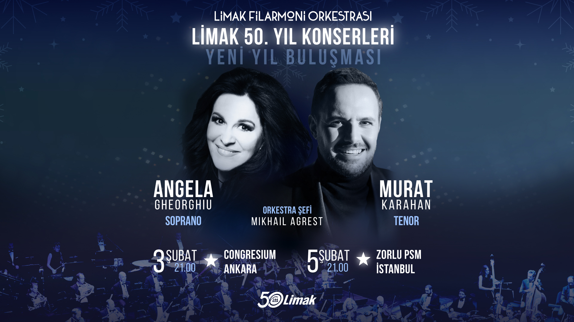 Limak Filarmoni Orkestrası, Limak Holding’in 50. kuruluş yılına özel olarak düzenlenen yeni yıl konserleri kapsamında Ankara ve İstanbul’da sanatseverlerle buluştu. Uluslararası üne sahip şef Mikhail Agrest yönetiminde sahne alan orkestra; dünyaca ünlü tenor Murat Karahan ve çağımızın en önemli sopranoları arasında gösterilen Rumen sanatçı Angela Gheorghiu ile birlikte iki şehirde unutulmaz performanslara imza attı. Yoğun ilgi gören konserleri toplam 6 bine yakın sanatsever izlerken, konserlerin tüm geliri Limak Vakfı tarafından yürütülen Türkiye’nin Mühendis Kızları programına aktarıldı.